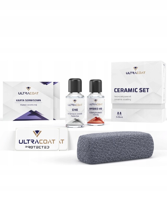 Ultracoat Ceramic Set to dwuskładnikowy kompozyt ceramiczny do zabezpieczenia zewnętrznych elementów auta. Składa się z powłoki ceramicznej One odpowiadającej za właściwości ochronne oraz powłoki kwarcowej Hydro HD, która gwarantuje idealne wykończenie powierzchni i bardzo silną hydrofobowość. Zastosowanie dwóch składników zapewnia doskonały wygląd, skuteczną ochronę i maksymalnie łatwą pielęgnację lakieru na okres do 3 lat lub 40.000 km przebiegu. Aplikacja obydwu powłok jest łatwa i przyjemna, dlatego bez trudu przeprowadzi ją zarówno profesjonalista, jak i każdy wprawiony miłośnik detailingu.